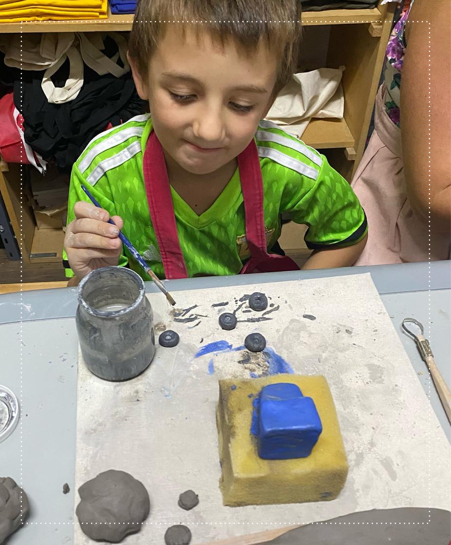🐝 El espacio y todos los materiales (arcillas, pinturas, pinceles, tablitas, delantales, crayones cerámicos y horneadas)