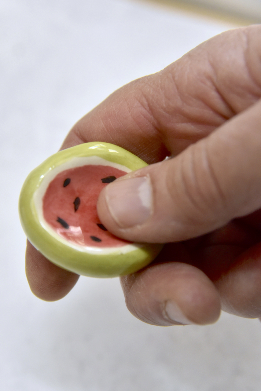 Son piedritas suaves, pintadas a mano con diseños frutales, y tienen una pequeña hendidura perfecta para apoyar el pulgar.